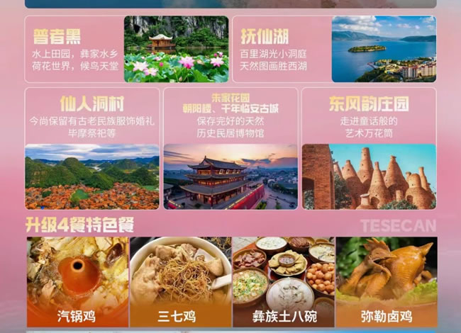 特色餐:三七雞,彝族特色餐,彌勒鹵雞,汽鍋雞,若客人自愿取消行程中所含正餐,視為自愿放棄,不退費(fèi)!客人因特殊情況(如身體不舒服)不參加團(tuán),餐退一半。