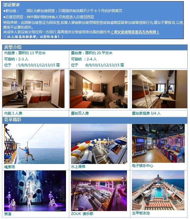 14、船上小費(fèi):星夢(mèng)套房以下艙房為每人每晚21新幣;星夢(mèng)套房(含)及以上房型每人每晚26新幣;2歲以下兒童免服務(wù)費(fèi);